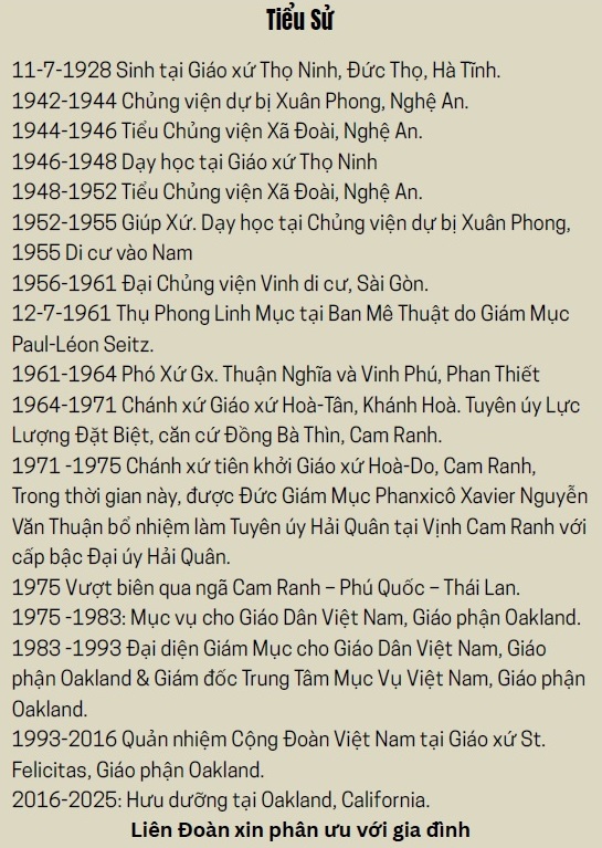 Trong tinh thần hiệp thông, Mục Vụ Văn Bút cho đăng lại Ai Tín và mấy dòng tiểu sử của Cố Linh mục Trần Thúc Định, Thánh Danh Gioa-an Baotixita, do Liên Đoàn thông báo, để độc giả cùng thông hiệp trong lời nguyện cầu cho linh hồn Cha Gio-an Baotixita được hưởng ơn nghĩa trong Nước Chúa.