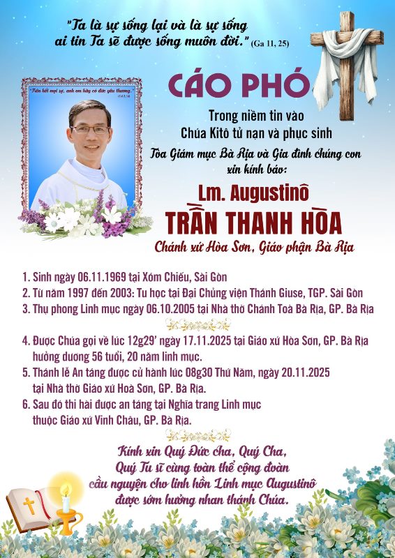 .Trong niềm hiệp thông phân ưu và nguyện cầu, Mục Vụ Văn Bút cho đăng lại Cáo Phó, Chương Trình Tang Lễ và mấy dòng Tiểu Sử của Cố Linh mục Trần Thanh Hoà, Thánh danh Augustinô, do Văn Phòng Toàn Giám Mục Bà Rịa sắp xếp để độc giả cùng thông hiệp trong lời nguyện cầu cho Linh Hồn Cha Augustinô được hưởng ơn nghĩa trong Nước Chúa.