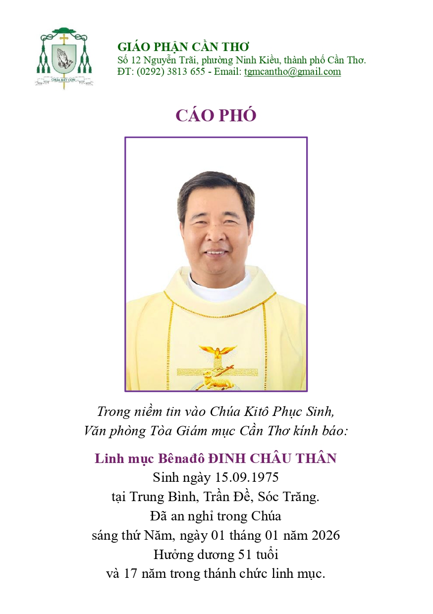 Trong niềm hiệp thông phân ưu và nguyện cầu, Mục Vụ Văn Bút cho đăng lại Cáo Phó, Chương trình Tang Lễ và mấy dòng tiểu sử của Cố Linh mục Đinh Châu Thân, Thánh danh Bênađô do Văn Phòng Toà Tổng Giám Mục Cần Thơ sắp xếp, để độc giả cùng thông hiệp trong lời nguyện cầu cho Linh Hồn Cha Benađô được hưởng ơn nghĩa trong Nước Chúa.