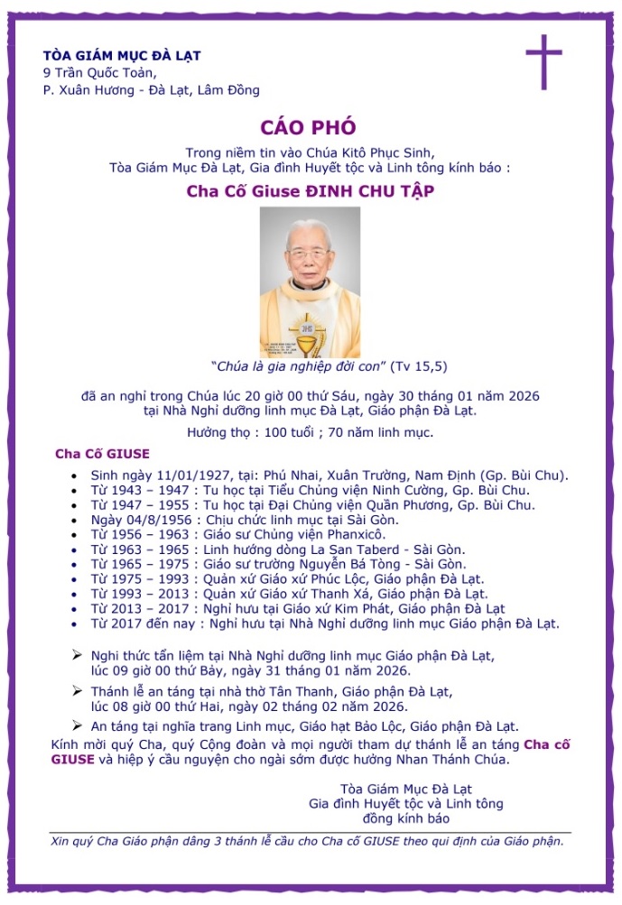 Trong niềm hiệp thông phân ưu và nguyện cầu, Mục Vụ Văn Bút cho đăng lại Cáo Phó, Chương trình Tang Lễ và mấy dòng tiểu sử của Cố Linh mục Đinh Chu Tập, Thánh danh Giuse do Văn Phòng Toà Giám Mục Đà Lạt sắp xếp, để độc giả cùng thông hiệp trong lời nguyện cầu cho Linh Hồn Cha Giuse được hưởng ơn nghĩa trong Nước Chúa.