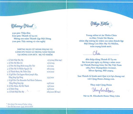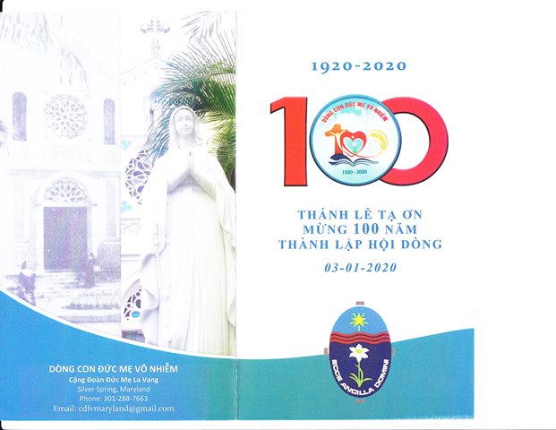 Hai Cộng Đoàn Con Đức Mẹ Vô Nhiễm, FMI, tại Hoa Kì là Cộng Đoàn La Vang thuộc Tổng Giáo Phận Washington (Hoa Thịnh Đốn) và Cộng Đoàn Thánh Giu-se thuộc Giáo Phận Richmond, Virginia tổ chức mừng kỉ niệm 100 năm thành lập tại Giáo Xứ Mẹ Việt Nam, 11814 New Hampshire Ave, Silver Spring, Maryland vào Thứ Sáu 03 Tháng 01, 2020 với những tiết mục: