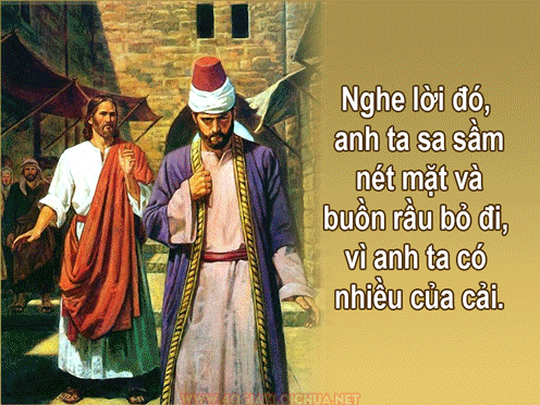 Và hôm nay, khi người thanh niên giàu có đến với Chúa Giêsu để hỏi Ngài “Phải làm gì để được sống đời đời”(x. Mc 10,17). Ngài không xua đuổi, không lên án anh ta có nhiều tiền bạc. Nhưng trái lại, Ngài ân cần chỉ dạy cho anh cách sử dụng tiền bạc: “Hãy đi bán những gì anh có mà cho người nghèo, anh sẽ được một kho tàng trên trời. Rồi hãy đến theo Tôi.” (Mc 10,21). Chúa chỉ cho anh ta biết cách tiêu tiền: Đổi tiền bạc để lấy nước trời. Đổi cái tạm thời để lấy cái vĩnh cửu. Chúa làm như vậy là muốn điều tốt cho anh ta. Nhưng đáng tiếc là anh ta không vượt qua được rào cản đó. Tin mừng cho biết “Anh ta sa sầm nét mặt và buồn rầu bỏ đi, vì anh ta có nhiều của cải”(Mc 10,22). Anh ta biết kiếm tiền, nhưng không biết sử dụng tiền. Chỉ thu tích chứ không biết chia sẻ. Do anh ta hà tiện, ích kỷ, keo kiệt. Thái độ chàng thanh niên cũng là thái độ của nhiều người trong chúng ta: Lo kiếm tiền, lo tích trữ tiền, nhưng không biết sử dụng tiền, không biết chia sẻ. Chắc chắn anh ta cũng chết và những người tích trữ nhiều tiền của cũng sẽ chết. Hãy nhớ câu ca dao này: “Vua Ngô ba sáu tấn vàng, chết xuống âm phủ chẳng mang được gì”. Chính Chúa Giêsu cũng đã cảnh giác người phú hộ tích trữ tiền bạc rằng: “Đồ ngốc! Nội đêm nay, người ta sẽ đòi lại mạng ngươi, thì những gì ngươi sắm sẵn đó sẽ về tay ai?Ấy kẻ nào thu tích của cải cho mình, mà không lo làm giàu trước mặt Thiên Chúa, thì số phận cũng như thế đó” (Lc 12, 20-21). Nơi khác Ngài nói: “Anh em đừng tích trữ cho mình những kho tàng dưới đất, nơi mối mọt làm hư nát, nơi kẻ trộm khoét vách và lấy đi. Nhưng hãy tích trữ cho mình những kho tàng trên trời, nơi mối mọt không làm hư nát, nơi trộm cắp không đào ngạch và lấy đi được. Vì kho tàng của anh ở đâu, thì lòng anh ở đó. (Mt 6,19-21)