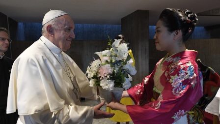 Khi đến nơi, ĐTC được Đức TGM Tokyo, cha xứ và cha Tổng Đại diện chào đón ở lối vào Nhà thờ. Sau đó tất cả tiến vào Nhà thờ và hai bạn trẻ dâng hoa cho ĐTC. ĐTC đến trước Nhà tạm, thinh lặng cầu nguyện.