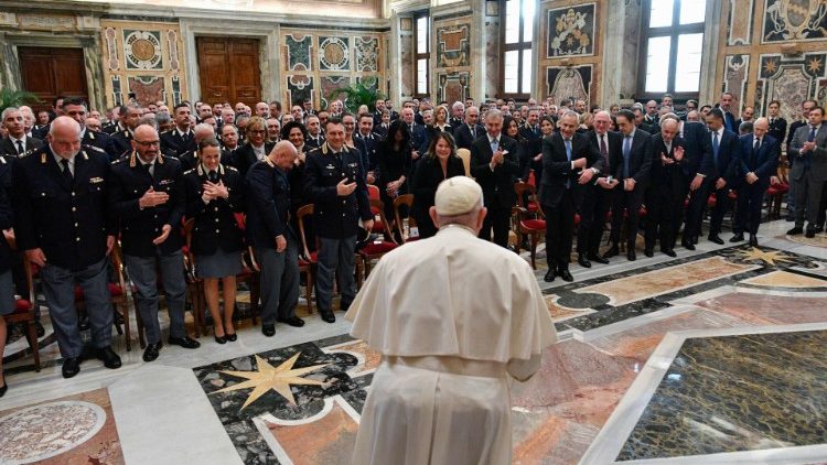 Ngỏ lời với các vị chỉ huy và nhân viên của đoàn cảnh sát, Đức Thánh Cha nói dịp gặp gỡ đầu năm này là cơ hội để ngài bày tỏ lòng biết ơn đối với sự phục vụ của họ. Ngài nói: “Trong khi thực hiện nhiệm vụ với tư cách là viên chức Nhà nước Ý, anh chị em cũng thể hiện mối quan hệ tốt đẹp giữa Ý và Tòa Thánh”.