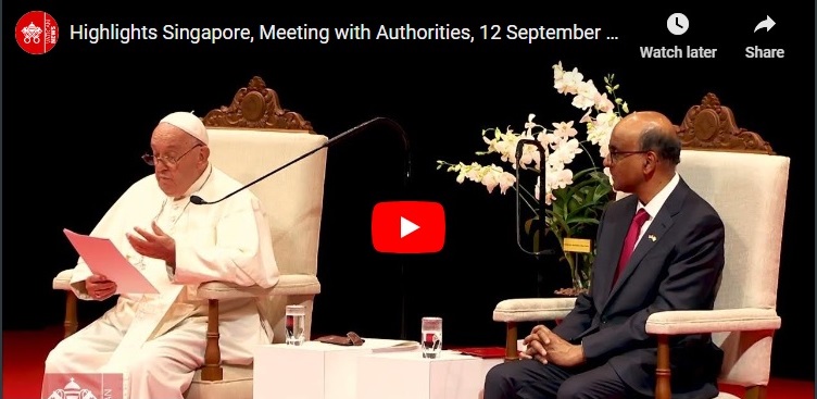 Cuối cùng, theo Đức Thánh Cha, "Singapore là một tấm gương sáng về những gì nhân loại có thể đạt được bằng cách hợp tác hài hòa, có tinh thần trách nhiệm và tinh thần liên đới và tình huynh đệ". Ngài khuyến khích họ tiếp tục con đường này, "tin tưởng vào lời hứa của Thiên Chúa và vào tình phụ tử của Người dành cho tất cả mọi người".