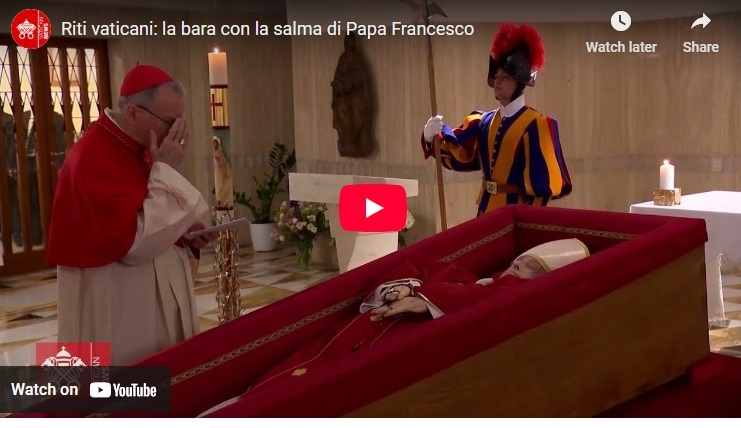 Vào lúc 9 giờ sáng thứ Tư, ngày 23/4/2025, quan tài với thi hài của Đức Giáo hoàng Phanxicô sẽ được đưa từ Nhà nguyện Domus Sanctæ Marthæ (Nhà Thánh Marta) đến Đền thờ Thánh Phêrô, theo quy định trong Nghi lễ an táng các Giáo hoàng (các số 41-65)".