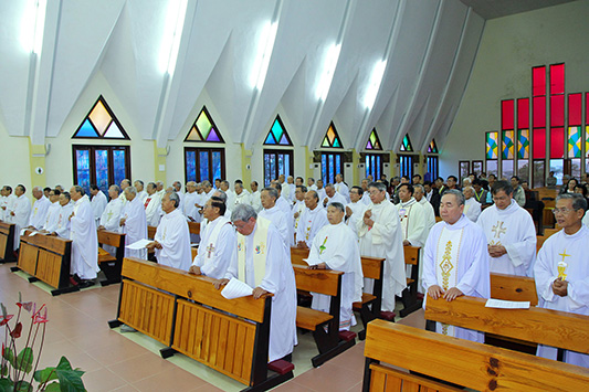 Sau phần chia sẻ tâm tình của các Giám Mục là Thánh lễ tạ ơn 60 năm thành lập Giáo Hoàng Học Viện thánh Piô X, do Đức Cha chủ nhà Antôn Vũ Huy Chương chủ tế, Đức Hồng Y Phêrô Nguyễn Văn Nhơn giảng. Dựa trên bài Tin Mừng Lc 17,11-19, Đức Hồng Y nhấn mạnh hai chữ “tạ ơn”: Khi được khỏi bệnh, người phong hủi ngoại giáo đã trở lại cám ơn. Chúa Giêsu đã hỏi: “Không phải cả mười người đều được sạch sao? Thế thì chín người kia đâu? Sao không thấy họ trở lại tôn vinh Thiên Chúa, mà chỉ có người ngoại bang này?” (Lc 17,17-18). Chúa muốn chúng ta phải tỏ lòng biết ơn vì mặc dù lời tạ ơn của chúng ta không thêm gì cho Chúa, nhưng nó mang lại lợi ích cho chúng ta. Khóa của Đức Hồng Y là khóa đầu tiên của Giáo Hoàng Học Viện, năm 1957, có 24 thầy, ở một ngôi nhà cũ trường Thiếu Sinh Quân của Pháp trước đó, sau thuộc Đại học Đà Lạt Khu B (nay là Đại học Yersin). Bước đầu đầy những khó khăn, lạ thầy, lạ trò, chẳng ai biết ai… Khởi đầu chỉ có mỗi cha Lacretelle (Pháp), dần dần 3 cha giáo khác mới tới: Bobbio (Ý), Ruiz (Tây Ban Nha), Deslierres (Canada) … Hai mươi bốn người đầu tiên cùng với bốn cha giáo thuộc bốn quốc tịch đã vất vả, kiên nhẫn để xây dựng một cộng đoàn hiệp nhất và yêu thương vuợt qua bao nhiêu ngỡ ngàng, bao nhiêu nỗi khổ. Nỗi khổ về ngôn ngữ: Các cha giáo không một ai biết một tiếng Việt, còn các thầy thì đa số chưa quen tiếng Pháp. Thế mà thánh lễ, giảng dạy, linh hướng, chuyện trò, xưng tội v.v… đều bằng tiếng Pháp. Nỗi khổ về óc địa phương: Anh em không biết nhau cho nên có khuynh hướng quy tụ từng địa phận. Nỗi khổ cô đơn: Ngôi nhà chúng tôi ở là một villa trên ngọn đồi mà chung quanh không có người ở. Từ sáng đến chiều vẫn chỉ mấy gương mặt quen thuộc, không có khách khứa, không có người thăm viếng, không có sinh hoạt nào khác, lại thêm trời lạnh và mưa. Nỗi khổ học hành: Ngày nào sáng – chiều trong suốt tuần lễ cũng đều học tiếng la tinh... Nhưng chính nhờ đó mà chúng tôi đã học được rất nhiều bài học và đã trưởng thành về nhiều phương diện…
