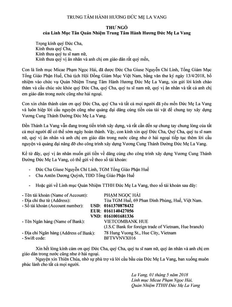 Đền thánh La Vang vẫn đang trong tiến trình xây dựng và cần đến sự chung tay chung lòng của tất cả mọi người để có thể sớm hoàn thành. Vậy con kính xin quý Đức cha, quý cha, quý tu sĩ nam nữ, quý vị ân nhân và anh chị em giáo dân