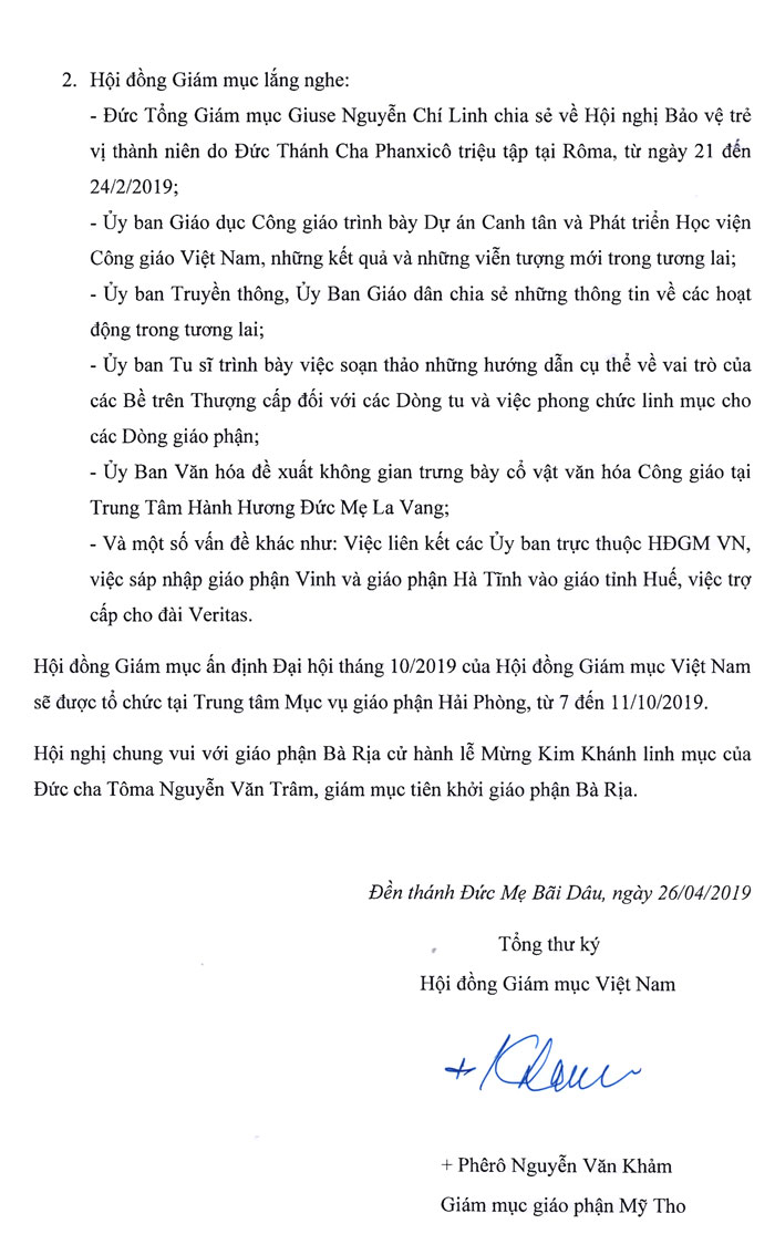 Hội đồng Giám mục Việt Nam đã họp Hội nghị thường niên kỳ 1/2019 tại Đền thánh Đức Mẹ Bãi Dâu, từ chiều thứ Hai ngày 22/04/2019 đến sáng thứ Sáu ngày 26/04/2019, với sự tham dự đầy đủ của các vị chủ chăn thuộc 27 giáo phận.
