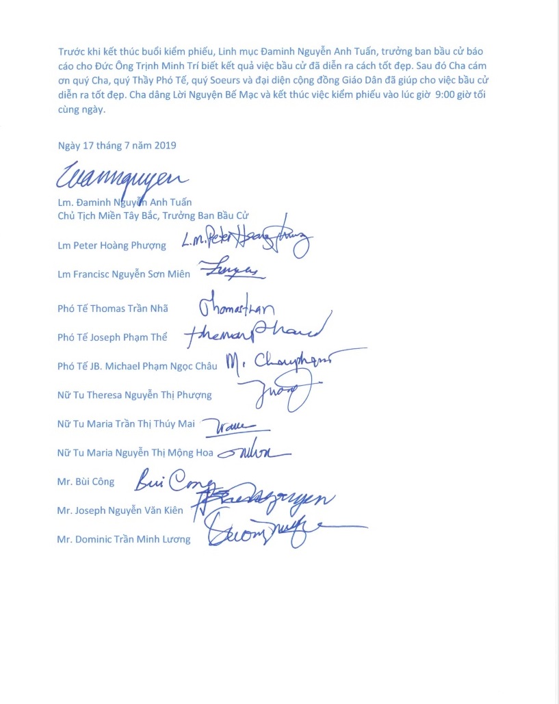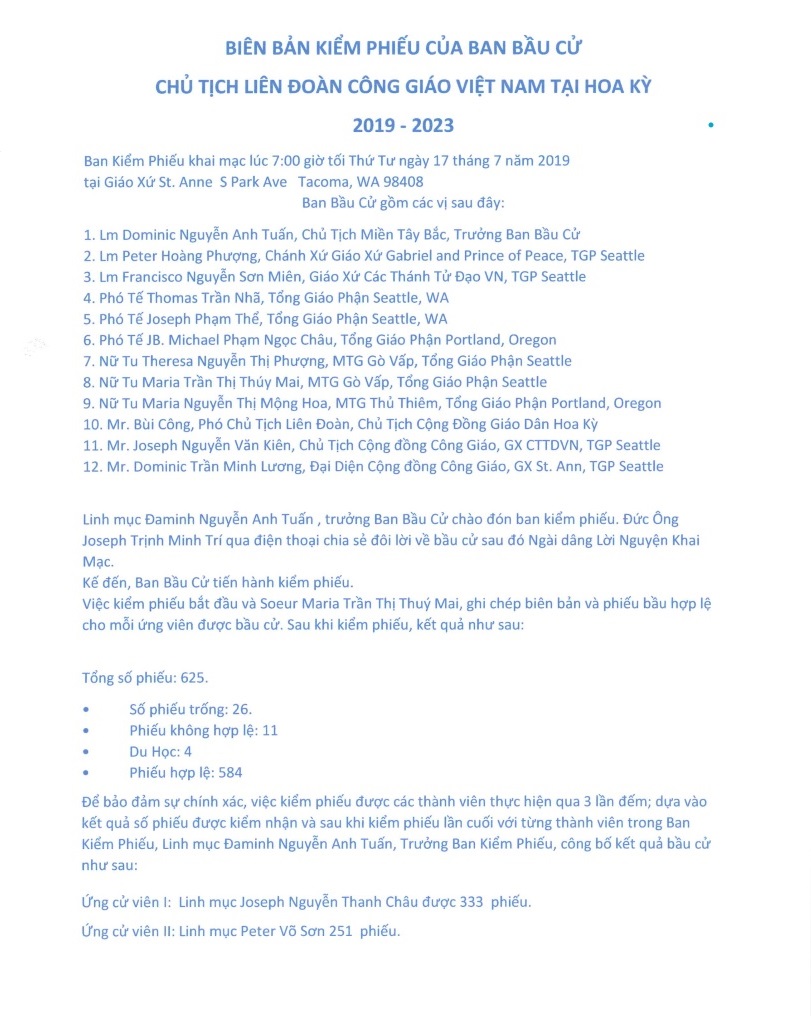 Sau đây là kết quả cuộc Bầu Cử Chủ Tịch Liên Đoàn Công Giáo VN tại Hoa Kì do Linh mục Nguyễn Anh Tuấn, Chủ Tịch Miền Tây Bắc Hoa Kì, Trưởng Ban Bầu Cử báo cáo ngày 17/07/2019.