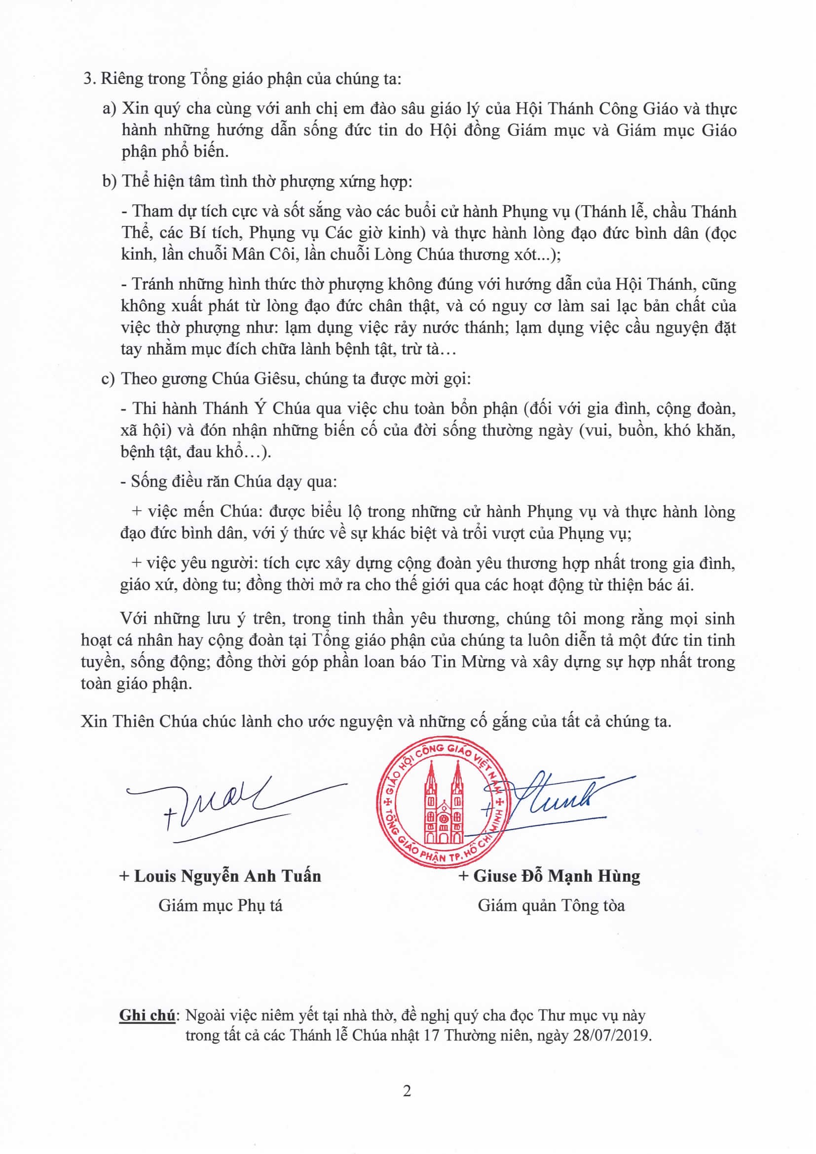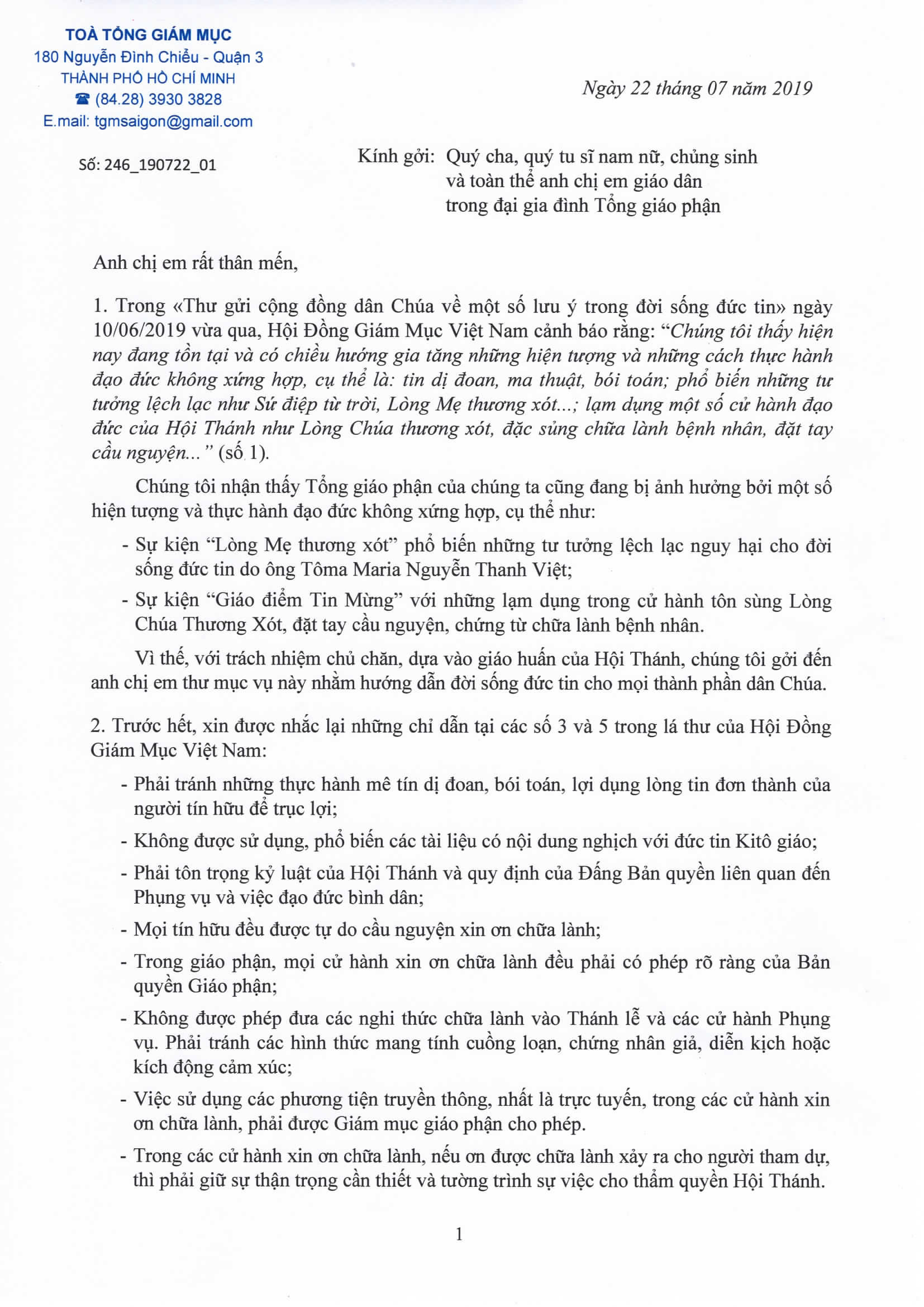 Thư được gửi đến hàng linh mục, tu sĩ và giáo dân trong Tổng Giáo Phận lưu ý về một số hiện tượng và thực hành đạo đức không xứng hợp như mê tín, dị đoan, bói toán, lợi dụng lòng tin đơn thành của người tín hữu để trục lợi hoặc lạm dụng trong việc cử hành bí tích.