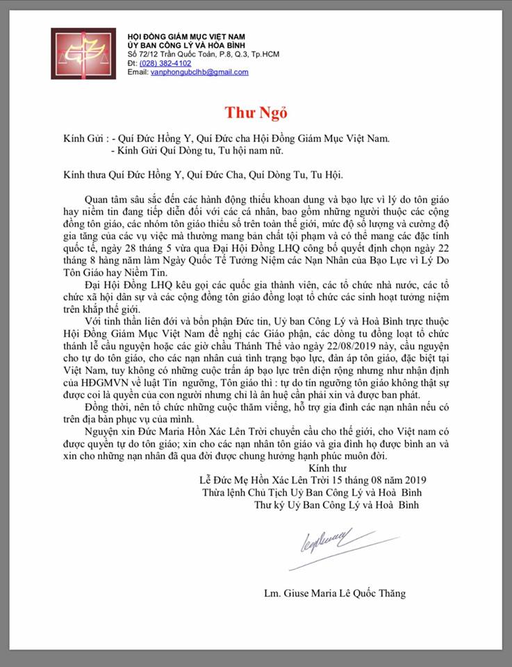 Thừa lệnh của Chủ tịch Uỷ Ban Công Lý và Hoà Bình trực thuộc Hội Đồng Giám Mục Việt Nam, ngày 15/08 - Lễ Đức Mẹ Hồn Xác Lên Trời vừa qua, Cha Giuse Maria Lê Quốc Thăng – Thư Ký Uỷ Ban – đã viết thư ngỏ mời gọi tổ chức thánh lễ và giờ chầu Thánh thể để cầu nguyện cho các nạn nhân của bạo lực trên toàn thế giới vì lý do tôn giáo. Sau đây là nguyên văn thư ngỏ: