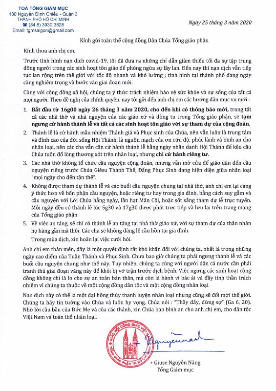 Kính gửi toàn thể cộng đồng Dân Chúa Tổng giáo phận. Kính thưa anh chị em. Trước tình hình nạn dịch covid-19, tôi đã đưa ra những chỉ dẫn giảm thiểu tối đa sự tập trung đông người trong các sinh hoạt tôn giáo để phòng ngừa sự lây lan.