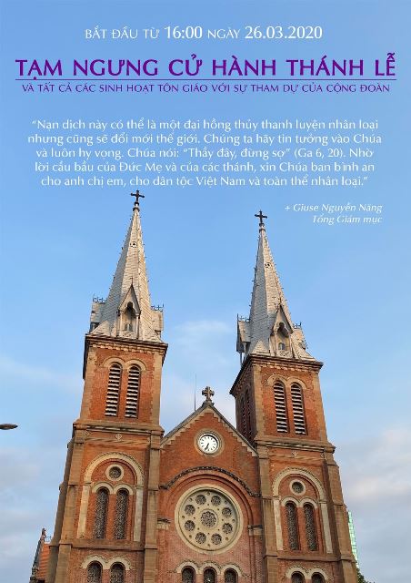 1. Bắt đầu từ 16g00 ngày 26 tháng 3 năm 2020, cho đến khi có thông báo mới, trong tất cả các nhà thờ và nhà nguyện của các giáo xứ và dòng tu trong Tổng giáo phận, sẽ tạm ngưng cử hành thánh lễ và tất cả các sinh hoạt tôn giáo với sự tham dự của cộng đoàn.