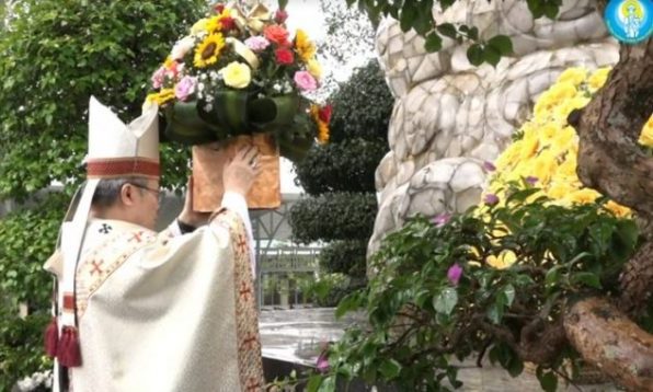 Đức Tổng Giám mục Nguyễn Chí Linh cầu nguyện: “Vì chúng con không có khả năng đối diện với đại dịch, chúng con đến đây hết lòng xin Đức Mẹ La Vang cứu giúp chúng con khỏi đại dịch Covid-19.”