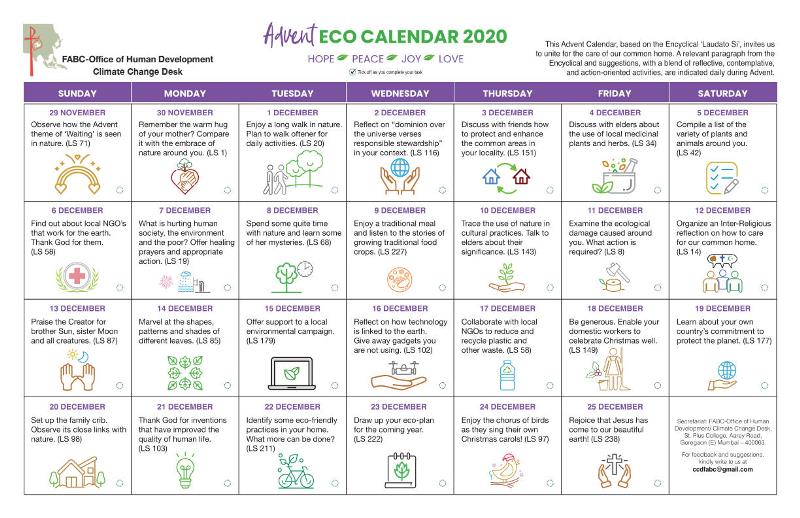 Lịch Sinh Thái Cho Mùa Vọng – 2020: Hy vọng - Bình an - Vui mừng – Yêu thương. Liên Hội Đồng Giám Mục Á Châu - Văn phòng Phát triển Con người - Ban Biến đổi Khí hậu.