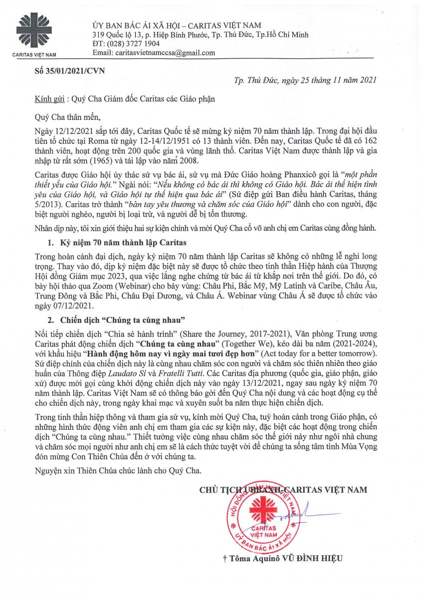Thư của Đức Cha Chủ Tịch Caritas Việt Nam, dịp kỉ niệm 70 năm thành lập Caritas quốc tế. Caritas Việt Nam được thành lập và gia nhập từ rất sớm (1965) và tái lập vào năm 2008.
