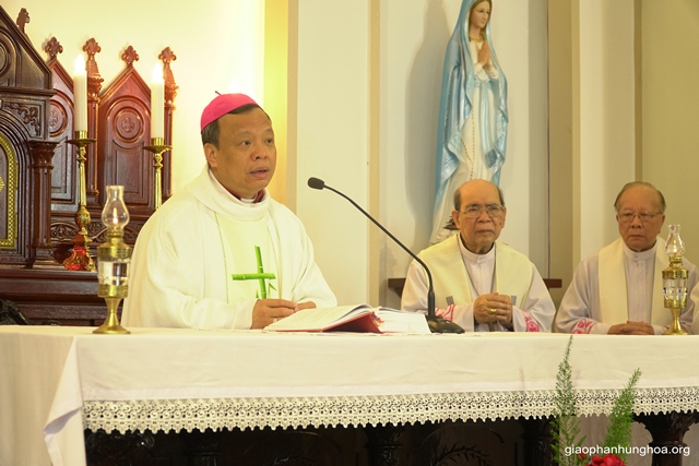 Trước khi bước vào Thánh lễ, Đức cha Đaminh nói lên lý do vì điều kiện thời gian và hoàn cảnh không cho phép, nên Thánh lễ không thể tổ chức tại nhà thờ Chính tòa với đông đủ các thành phần dân Chúa, để cùng tạ ơn với Đức cha Phêrô trong ngày chia tay Giáo phận Hưng Hóa. Đặc biệt, Đức cha Đaminh bày tỏ tâm tình tri ân tới Đức cha Phêrô, trong suốt hơn một năm qua, với tư cách là vị chủ chăn của giáo phận đã luôn yêu thương, hăng say nhiệt thành và dấn thân rất nhiều trong mọi lĩnh vực, và giúp cho giáo phận có những tầm nhìn, mở ra với những khung trời mới, để ngày càng thăng tiến và phát triển hơn. Đức cha Đaminh cũng nói lên Hưng Hóa luôn dành cho Đức cha Phêrô một tình cảm hết sức đặc biệt, mỗi khi ngài trở lại tại Tòa Giám mục hay bất cứ nơi nào trong giáo phận, để nghỉ ngơi, làm việc hay tĩnh tâm. Đồng thời, ngài cũng cầu chúc cho Đức cha Phêrô trở về sứ vụ tại Giáo phận Vinh được tràn đầy hồng ân Thiên Chúa.