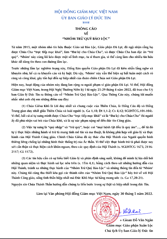 Ủy ban Giáo lý Đức Tin trực thuộc Hội Đồng Giám Mục Việt Nam Thông cáo về “Nhóm Trừ Quỷ Bảo Lộc. Từ năm 2015, một nhóm nhỏ tín hữu thuộc Giáo xứ Bảo Lộc, Giáo phận Đà Lạt, đã ngộ nhận rằng họ được Chúa Cha “trực tiếp mạc khải”, làm “thư ký cho Chúa Cha”, và được Chúa Cha ban đặc ân “trừ quỷ”. ‘Nhóm’ này cũng lôi kéo được một số linh mục, tu sĩ tham gia, vì thế càng làm cho nhiều tín hữu khác dễ dàng tin theo con đường lầm lạc.