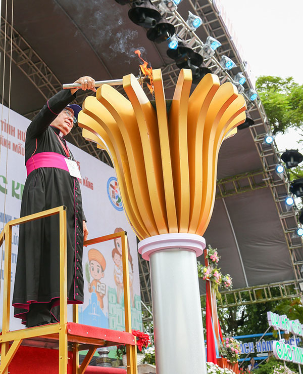 Tiếp đến là nghi thức thượng cờ như một sự biểu dương về đời sống đức tin, sự hiệp thông với Giáo Hội và tinh thần dấn thân của người trẻ để trở thành chứng nhân của niềm hy vọng. Sau đó, Đức Tổng Giuse Đặng Đức Ngân thắp đuốc và chính thức tuyên bố khai mạc Đại hội Giới trẻ Giáo tỉnh Huế 2025.