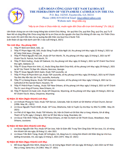 Danh Sách tân Linh Mục thụ phong và linh mục kỉ niệm ngân khánh, kim khánh và ngọc khánh . Danh Sách tân Linh Mục thụ phong và linh mục kỉ niệm ngân khánh, kim khánh và ngọc khánh mùa hè 2021 tại Hoa Kì.