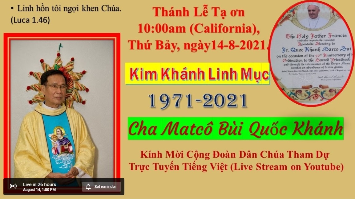Được tin Linh mục Bùi Quốc Khánh, Thánh danh Marcô, mừng kim khánh 50 năm Linh Mục và Thượng Thọ Cửu Tuần với Thánh Lễ Tạ Ơn tại Nguyện Đường Các Thánh Tử Đạo Việt Nam: 685 Singleton Rd, San Jose, CA 95111, Thứ Bảy 14 tháng 8/ 2021 lúc 10:00g sáng, Mục Vụ Văn Bút cùng hiệp thông tâm tình cảm tạ với Cha và chúc mừng Cha vui sống tuổi thọ của đời linh mục.