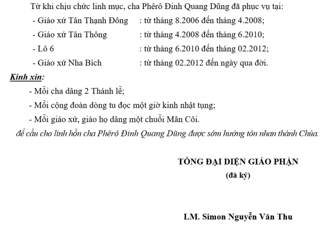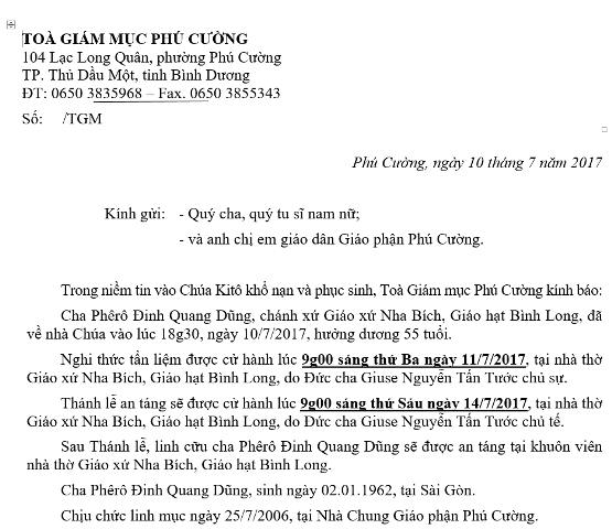 Mục Vụ Văn Bút sẽ cho đăng bổ túc tin Cáo phó, chương trình lễ an táng và vài dòng tiểu sử của linh mục quá cố do Toà GM Phú Cường sắp xếp.