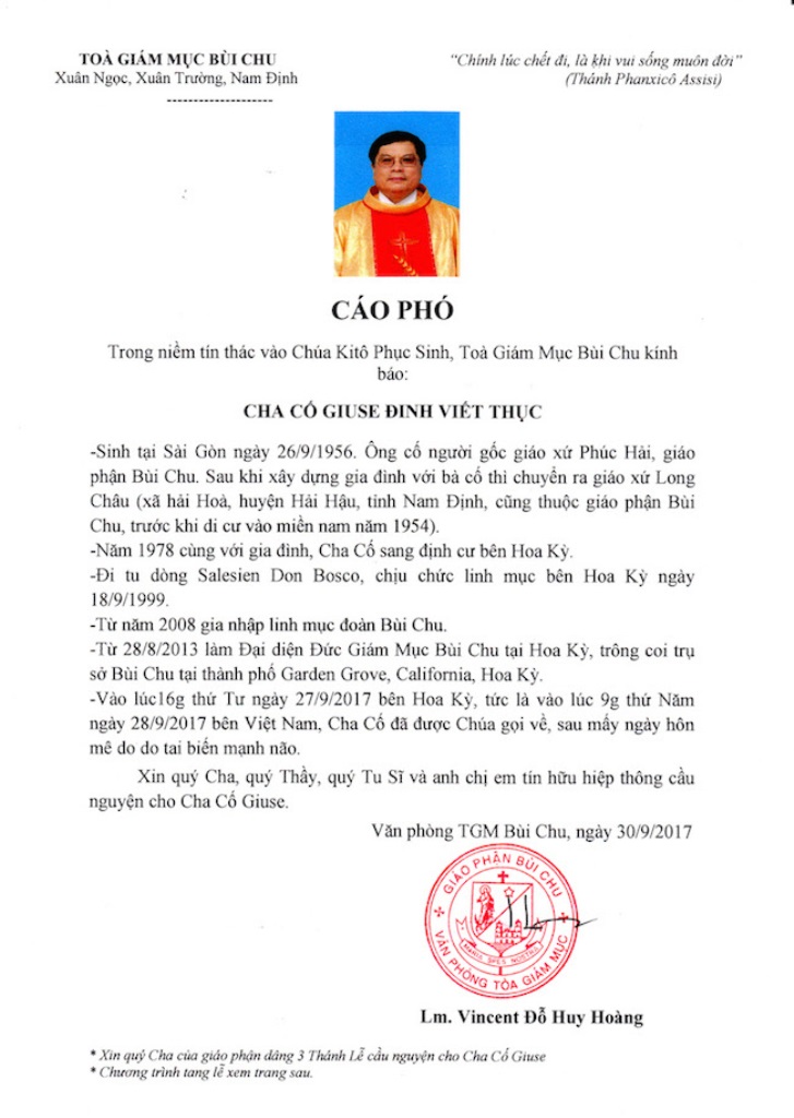 Còn theo Cáo phó của Giáo Phận Bùi Chu,