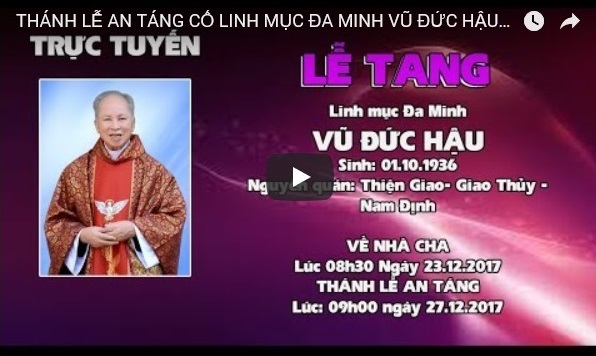 Trong niềm thương tiếc vô hạn, Tòa Giám mục Ban Mê Thuột Kính báo: Linh mục Đa Minh Vũ Đức Hậu, Quản xứ Bác Ái, đã qua đời vì tai nạn giao thông lúc 08g00 thứ bảy, ngày 23 tháng 12 năm 2017. Hưởng thọ 79 tuổi, với 51 năm Linh mục.