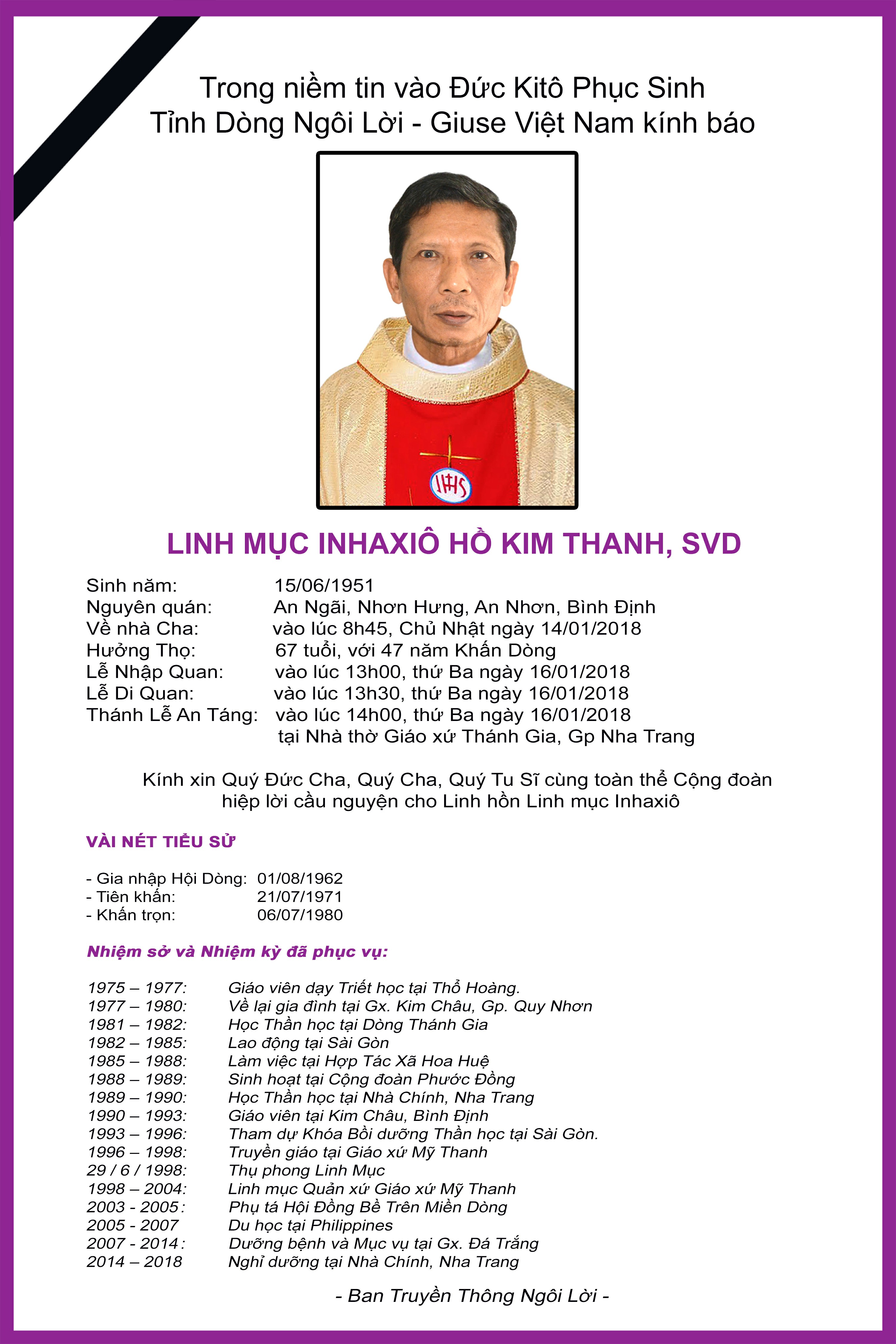Trong niềm hiệp thông phân ưu và cầu nguyện, Mục Vu Văn Bút cho đăng lại Ai Tín, Chương Trình Tang Lễ và mấy dòng tiểu sử của Lm Hồ Kim Thanh, SVD, Thánh danh I-nha-xi-ô do Ban Truyền Thông Dòng Ngôi Lời sắp xếp để độc giả cùng thông hiệp.