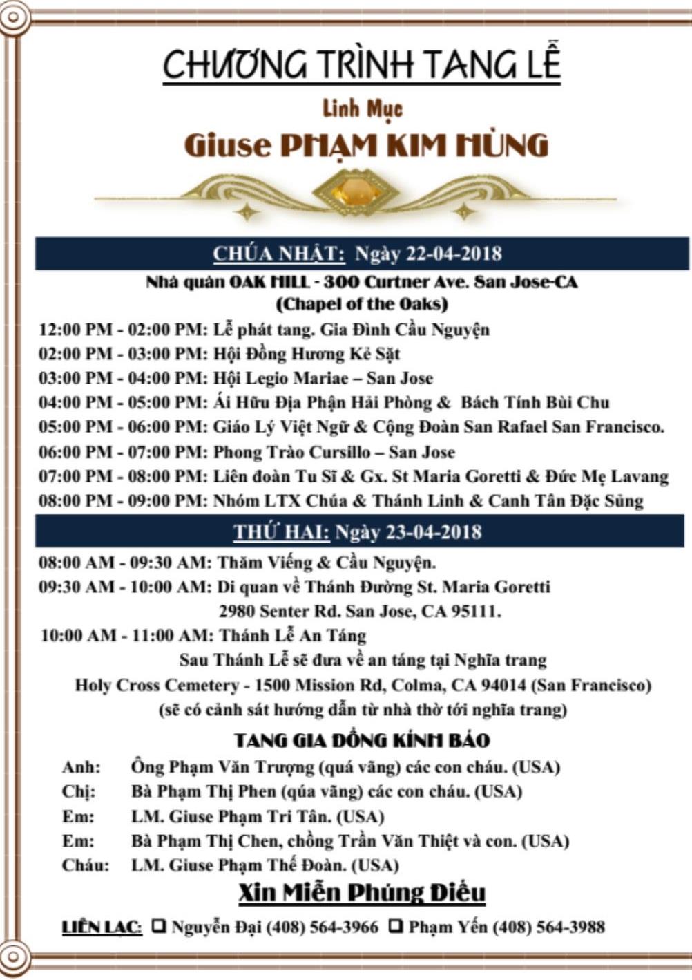 Trong niềm hiệp thông phân ưu và nguyện cầu, Mục Vụ Văn Bút cho đăng lại tin Cáo phó, Chương trình Lễ An táng của Linh Mục Giuse Phạm Kim Hùng do Tang Gia sắp xếp để độc giả cùng thông hiệp trong lời nguyện cầu. – Mục Vụ Văn Bút.
