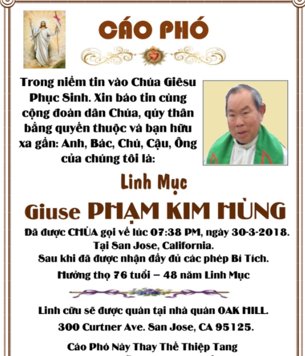 Lm Phạm Kim Hùng đã kết thúc cuộc lữ hành trần thế tại San Jose, California