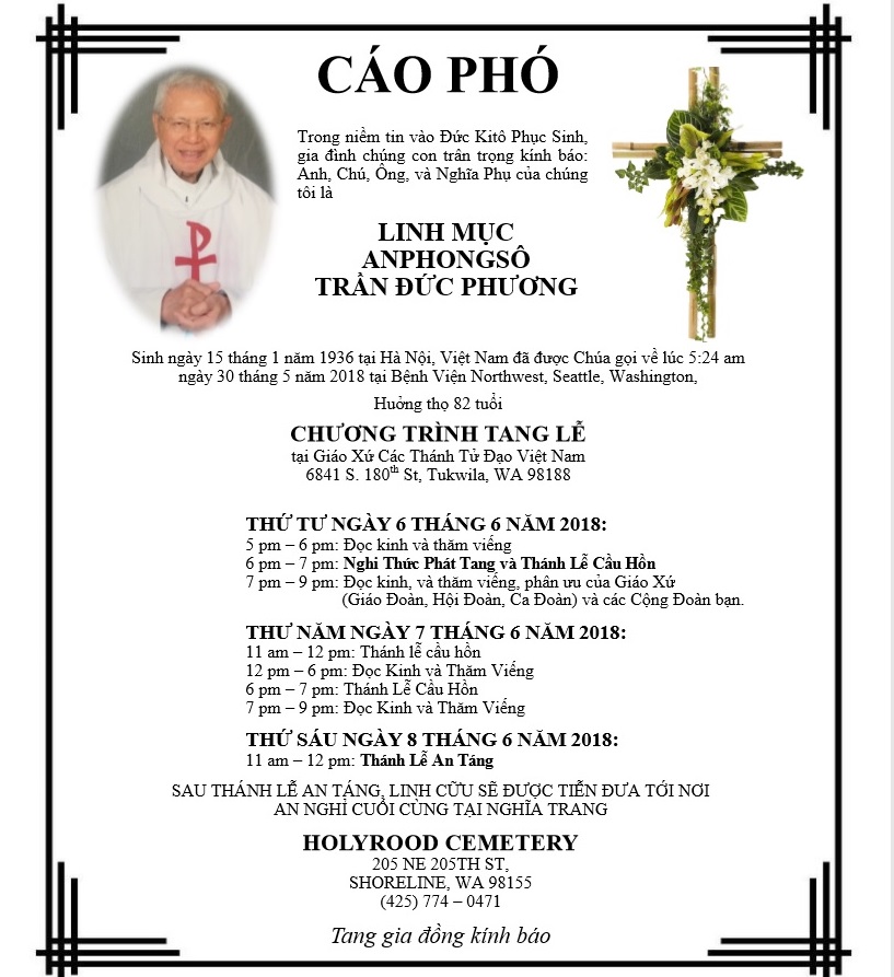 Trong niềm hiệp thông phân ưu và cầu nguyện, Mục Vu Văn Bút cho đăng lại Cáo Phó, Chương Trình tang lễ và mấy dòng tiểu sử của Linh Mục Trần Đức Phương, Thánh danh An-phong-sô, do tang gia đăng trên Bản Tin Mục Vụ, Giáo Xứ Các Thánh Tử Đạo Việt Nam,