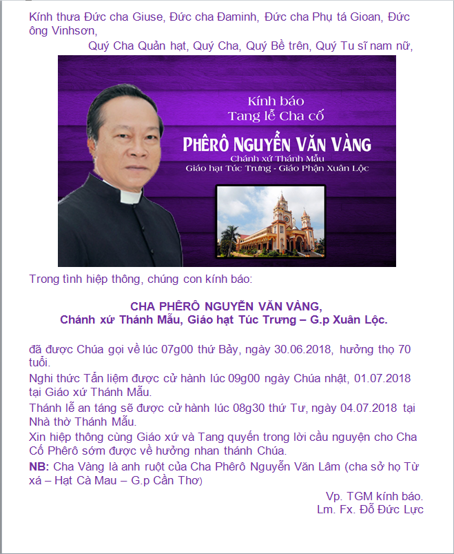 Trong niềm hiệp thông phân ưu và cầu nguyện, Mục Vu Văn Bút cho đăng lại Ai Tín, Thánh Lễ An táng Linh mục Nguyễn Văn Vàng, Thánh danh Phêrô, do Văn Phòng Toà Giám Mục Xuân Lộc sắp xếp để độc giả cũng cùng hiệp thông: