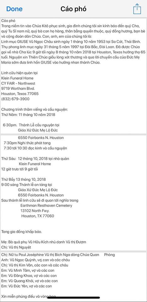 Nhận được tin Linh Mục Vũ Ngọc Châu, Thánh danh Giuse, mới qua đời tại Houston, Mục Vụ Văn Bút cho đăng lại Cáo Phó, Chương trình Lễ An táng, để độc giả hiệp thông trong lời nguyện cầu cho linh hồn Cha Giuse được hưởng ơn nghĩa trong Nước Chúa hằng sống.