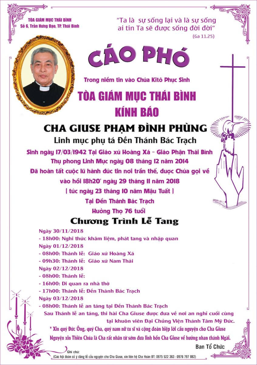 Cha Giuse Phạm Đình Phùng sinh ngày 17 tháng 3 năm 1942 tại Giáo xứ Hoàng Xá - Giáo phận Thái Bình, thụ phong Linh mục ngày 8 tháng 12 năm 2014 thuộc Linh mục đoàn Giáo phận Thái Bình, đã được Chúa gọi về lúc 18h20 ngày 29 tháng 11 năm 2018. Hưởng thọ 76 tuổi.