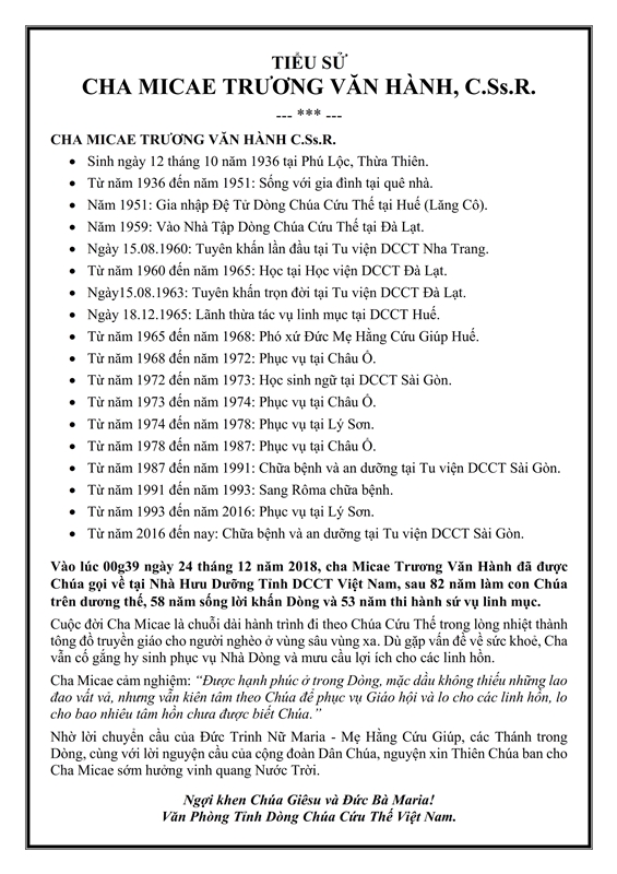 Được tin Linh mục Trương Văn Hành, Thánh danh Micae, Dòng Chúa Cứu Thế  mới qua đời tại Nhà Hưu Dưỡng của Dòng, Mục Vụ Văn Bút cho đăng lại Cáo Phó, Chương trình Lễ An táng và mấy dòng Tiểu sử do Văn Phòng Tỉnh Dòng sắp xếp để độc giả cùng thông hiệp trong lời nguyện cầu cho linh hồn Cha Micae.