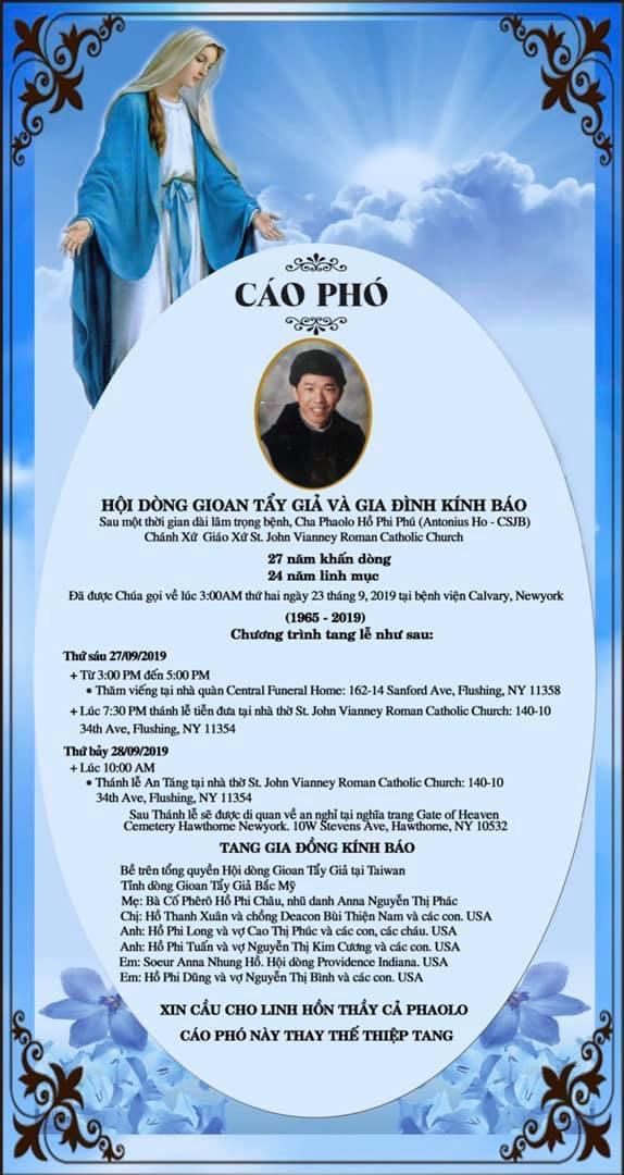 Trong niềm hiệp thông phân ưu và nguyện cầu, Mục Vụ Văn Bút cho đăng lại Cáo Phó, Chương trình tang lễ của Linh mục Hồ Phi Phú, thánh danh Phao-lô do Hội Dòng Thánh Gio-an Tẩy Giả và Tang Quyến sắp xếp để độc giả cùng thông hiệp trong lời nguyện cầu cho Linh hồn Cha Phao-lô.