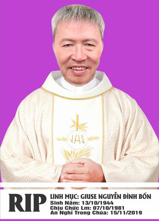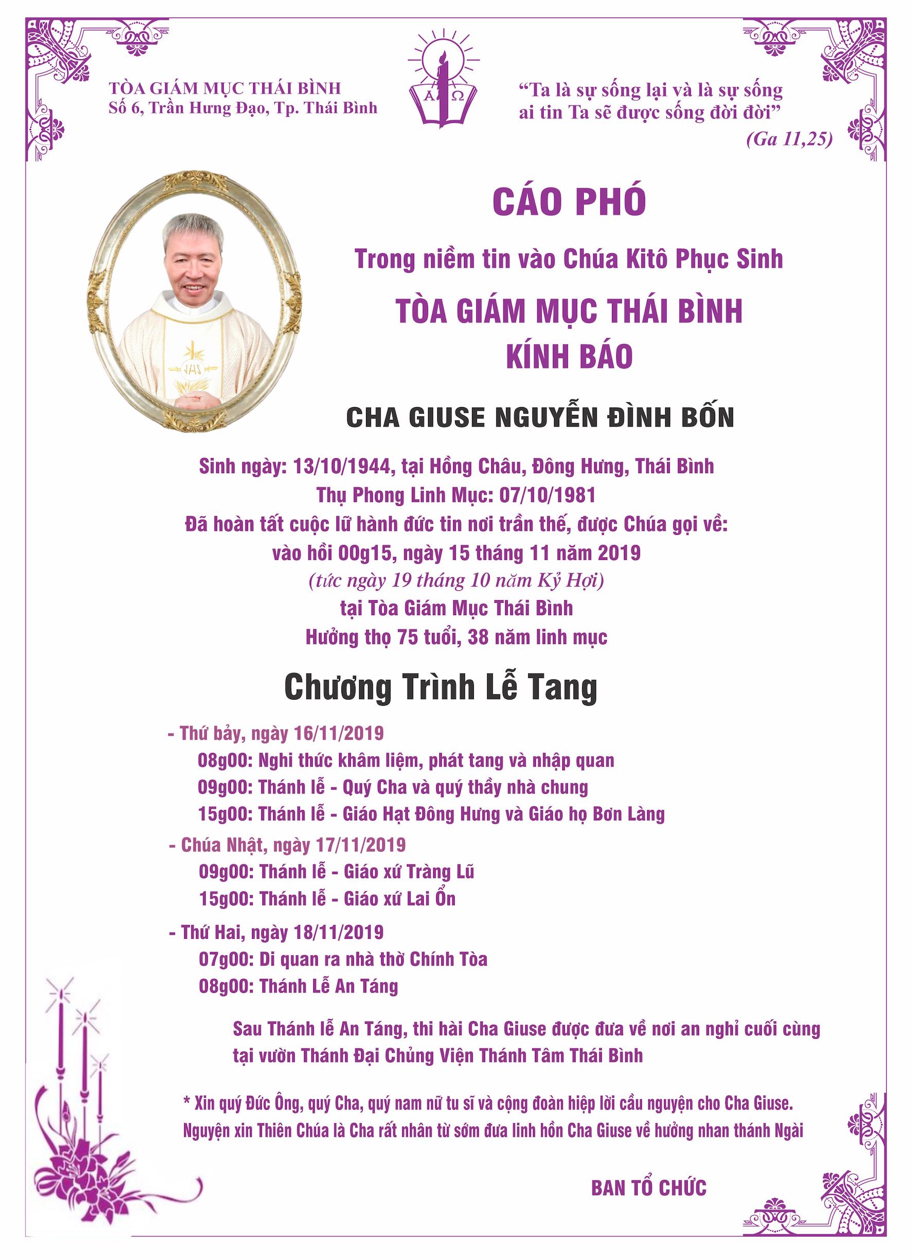 Được tin linh mục Nguyễn Đình Bốn, thánh danh Giu-se mới qua đời, Mục Vụ Văn Bút cho đăng lại tin Cáo Phó, Chương trình Lễ An táng do Văn Phòng Toà Giám Mục Thái Bình sắp xếp để độc giả cùng thông hiệp trong lời nguyện cầu cho linh hồn Cha Giuse.