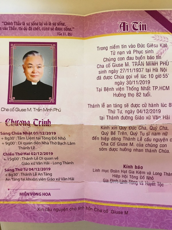 Được tin linh mục Trần Minh Phú, thánh danh Giuse, sinh tại Hà Nội, linh mục gốc Phát Diệm, nhập Giáo Phận Xuân Lộc, mới qua đời, Mục Vụ Văn Bút cho đăng lại tin Ai Tín, Chương trình Lễ An táng do Linh mục Đoàn Hạt Gia Kiệm sắp xếp để độc giả cùng thông hiệp trong lời nguyện cầu cho linh hồn Cha Giu-se.