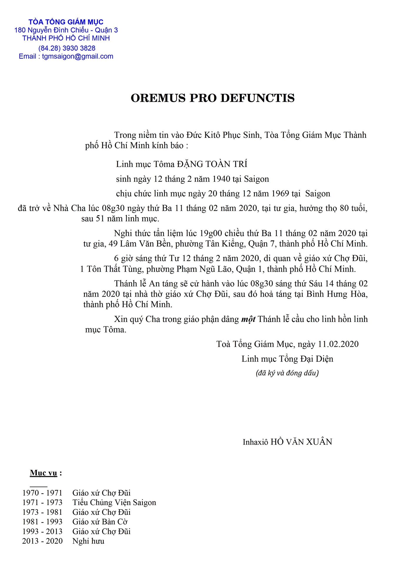Được tin linh mục Đặng Toàn Tri, thánh danh Tôma, mới qua đời, Mục Vụ Văn Bút cho đăng lại Cáo Phó, Chương trình Tang Lễ do Toà Tổng Giám Mục Sài Gòn sắp xếp để độc giả cùng thông hiệp trong lời nguyện cầu cho linh hồn Cha Tôma.