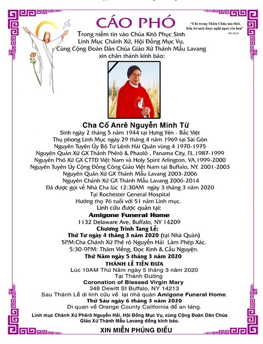 Được tin linh mục Nguyễn Minh Từ, thánh danh Anrê, mới qua đời tại Rochester General Hospital, Rochester, New York, Mục Vụ Văn Bút cho đăng lại Cáo Phó, Chương trình Tang Lễ do Linh mục Nguyễn Hai và Giáo xứ Thánh Mẫu La Vang Buffalo sắp xếp để độc giả cùng thông hiệp trong lời nguyện cầu cho linh hồn Cha Cố Anrê.