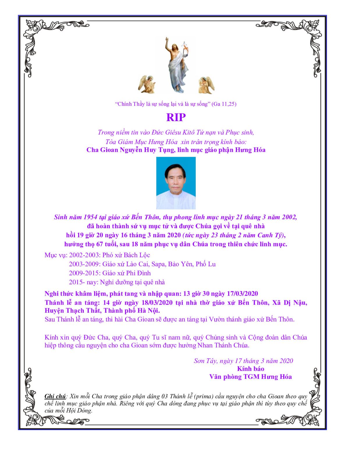 Được tin linh mục Nguyễn Huy Tụng, thánh danh Gioan, đã đã qua đời tại Sơn Tây, Mục Vụ Văn Bút cho đăng lại Cáo Phó, Chương trình Tang Lễ do Văng Toà Giám mục Hưng Hoá sắp xếp để độc giả cùng thông hiệp trong lời nguyện cầu cho linh hồn Cha Gioan.