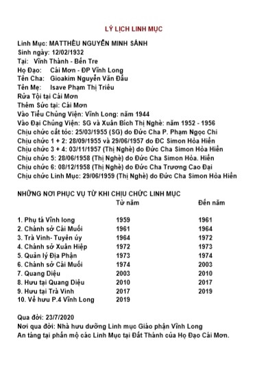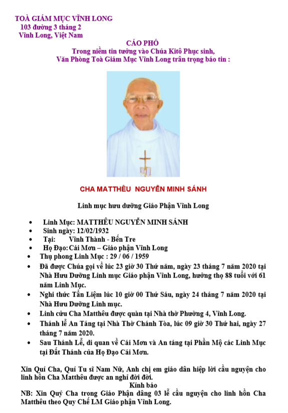 Được tin Linh mục Nguyễn Minh Sánh, thánh danh Matthêu, đã qua đời tại Vĩnh Long, Mục Vụ Văn Bút cho đăng lại tin Cáo Phó, Chương trình Tang Lễ và tiểu sử do Toà Giám Mục Vĩnh Long sắp xếp, để độc giả cùng thông hiệp trong lời nguyện cầu cho linh hồn Matthêu.