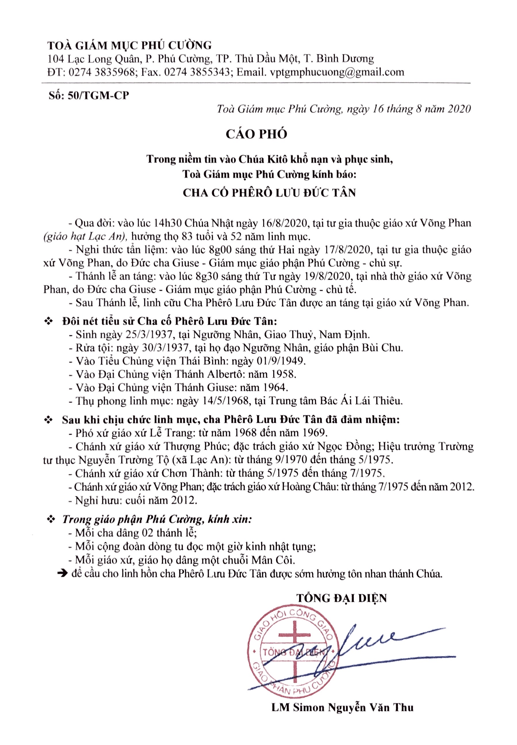 Được tin Linh mục Lưu Đức Tân, thánh danh Phêrô, đã qua đời tại Lạc An, Mục Vụ Văn Bút cho đăng lại tin Cáo Phó, Chương trình Tang Lễ và tiểu sử do Toà Giám Mục Phú Cường sắp xếp, để độc giả cùng thông hiệp trong lời nguyện cầu cho linh hồn Cha Phêrô.