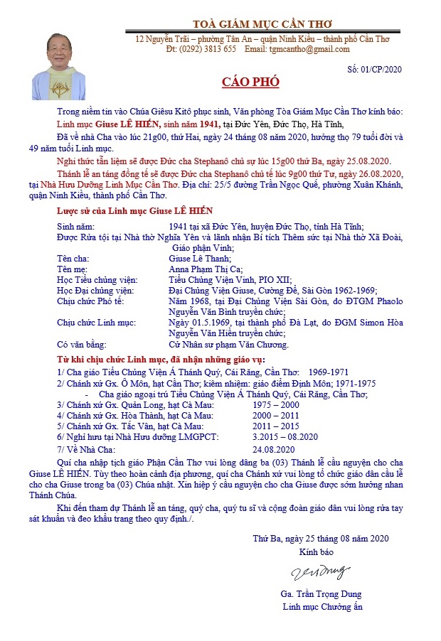 Được tin Linh mục Lê Hiến, thánh danh Giuse, đã qua đời tại Cần Thơ, Mục Vụ Văn Bút cho đăng lại tin Cáo Phó, Chương trình Tang Lễ và tiểu sử do Toà Giám Mục Cần Thơ sắp xếp, để độc giả cùng thông hiệp trong lời nguyện cầu cho linh hồn Cha Giuse.