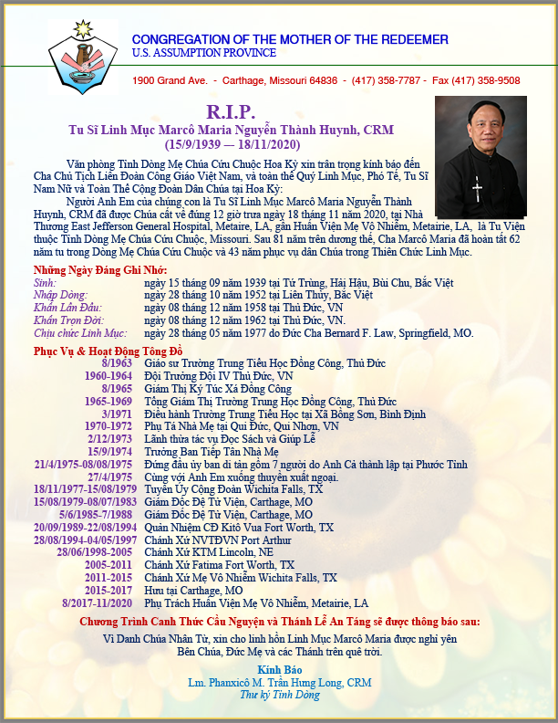 Được tin Linh mục Nguyễn Thành Huynh, thánh danh Marcô Maria, thuộc Tỉnh Dòng Mẹ Đấng Cứu Chuộc Hoa Kì, Mục Vụ Văn Bút cho đăng lại tin Cáo Phó, mấy dòng tiểu sử và Chương trình Tang Lễ do Văn Phòng Tỉnh Dòng liên hệ sắp xếp, để độc giả cùng thông hiệp trong lời nguyện cầu cho linh hồn Cha Marcô Maria.
