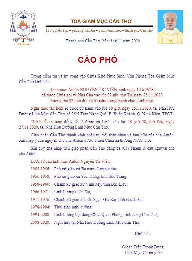 Được tin Linh mục Nguyễn Tri Viễn, thánh danh An-tôn, thuộc Giáo Phận Cần Thơ, Mục Vụ Văn Bút cho đăng lại tin Cáo Phó, mấy dòng tiểu sử và Chương trình Tang Lễ do Lm Trần Trọng Dung, Chưởng Ấn Giáo Phận sắp xếp, để độc giả cùng thông hiệp trong lời nguyện cầu cho linh hồn Cha An-tôn.