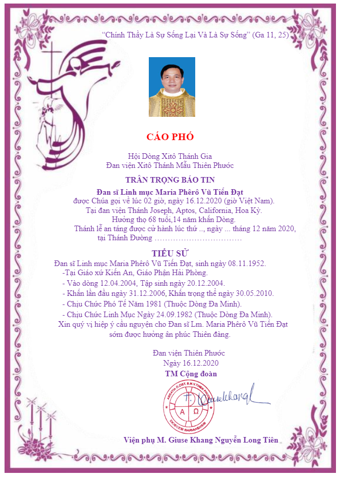 Trong niềm hiệp thông phân ưu và nguyện cầu, Mục Vụ Văn Bút cho đăng lại Cáo Phó, chương trình lễ an táng (chưa ấn định nhà thờ) và mấy dòng tiểu sử của Linh mục Vũ Tiến Đạt, Thánh Danh Maria Phê-rô do Viện Phụ M. Giuse Khang Vũ Long Tiên cung cấp, để độc giả cùng thông hiệp trong lời cầu nguyện cho Linh Hồn Cha Maria Phê-rô.