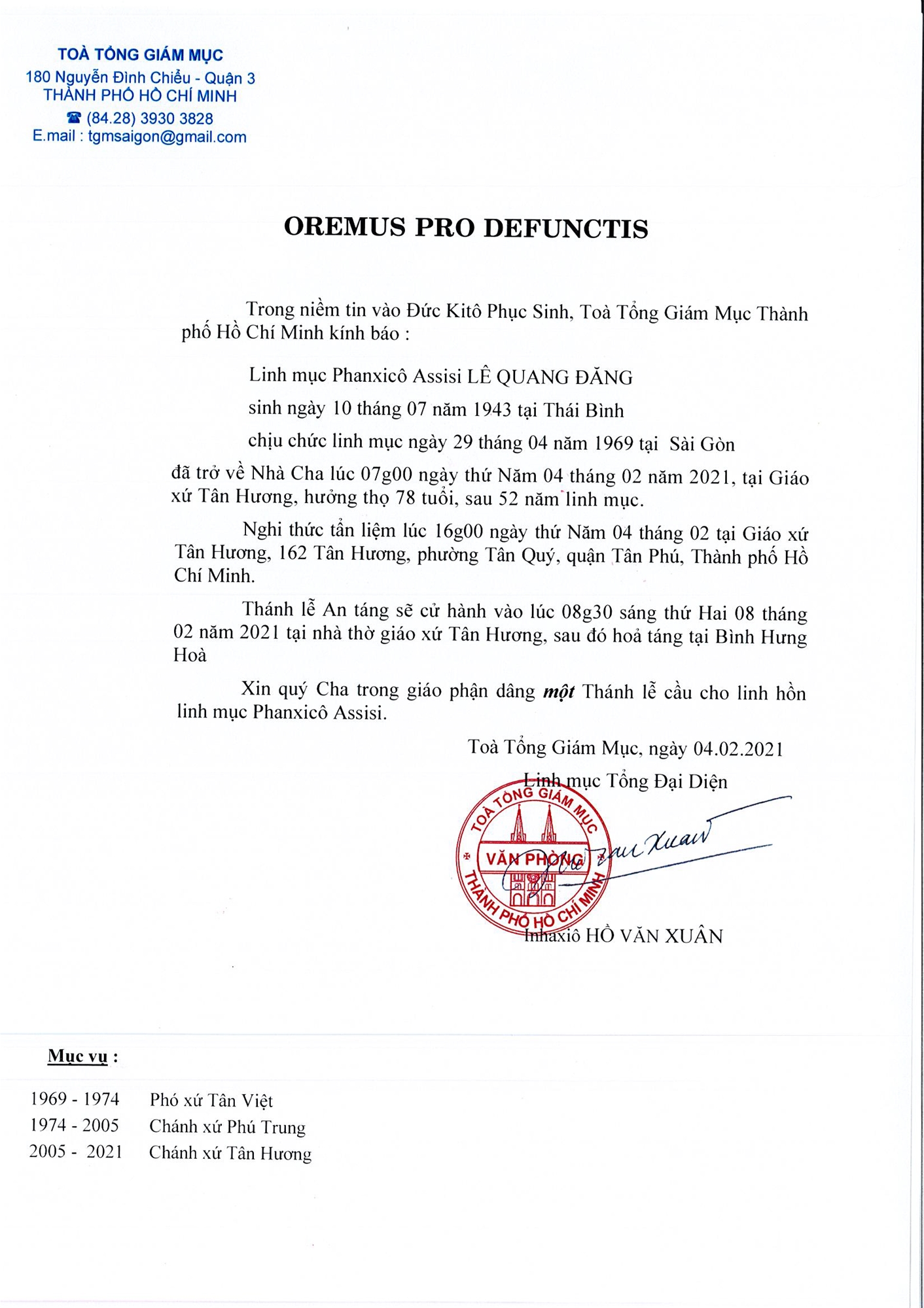 Được tin Linh mục Lê Quang Đăng, thánh danh Phanxicô Assisi mới qua đời tại Sài Gòn, Mục Vụ Văn Bút cho đăng lại tin Cáo Phó, Chương trình Tang Lễ, do Tòa Tổng Giám mục sắp xếp, để độc giả cùng thông hiệp trong lời nguyện cầu cho linh hồn Cha Phanxicô Assisi: